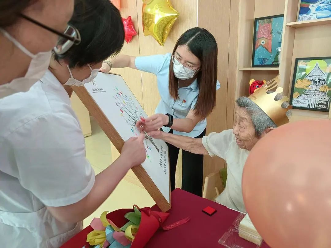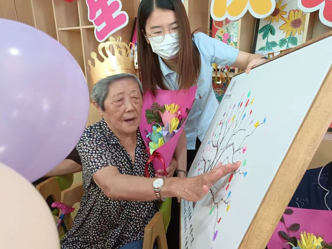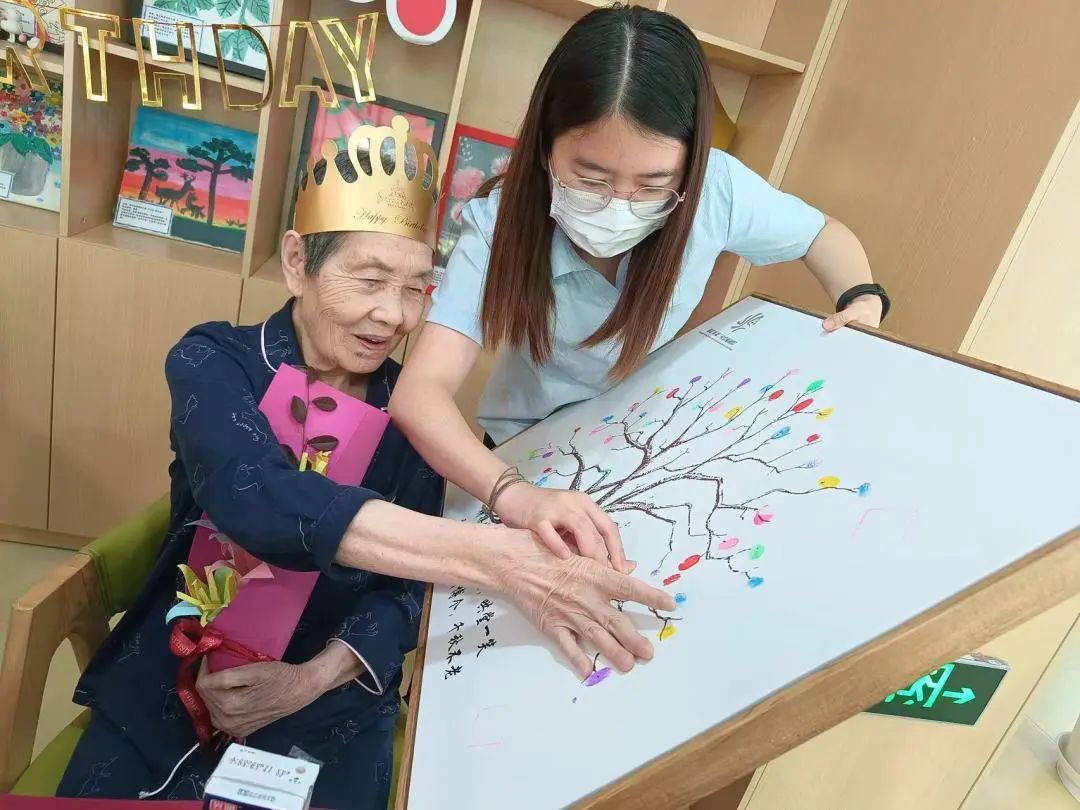 活动最后,老寿星们依次在生命树相框上用印留念。生命树是二福院为院内长者准备的一份集体生日礼物,这是一份关于爱与陪伴的礼物,树干代表着二福院及全体职工。每位老人在生日当月用彩色印泥在树枝上按下珍贵的指印,到了年底就将变成一颗枝繁叶茂、生机勃勃的参天大树。