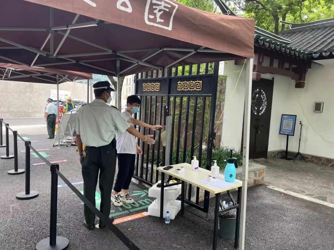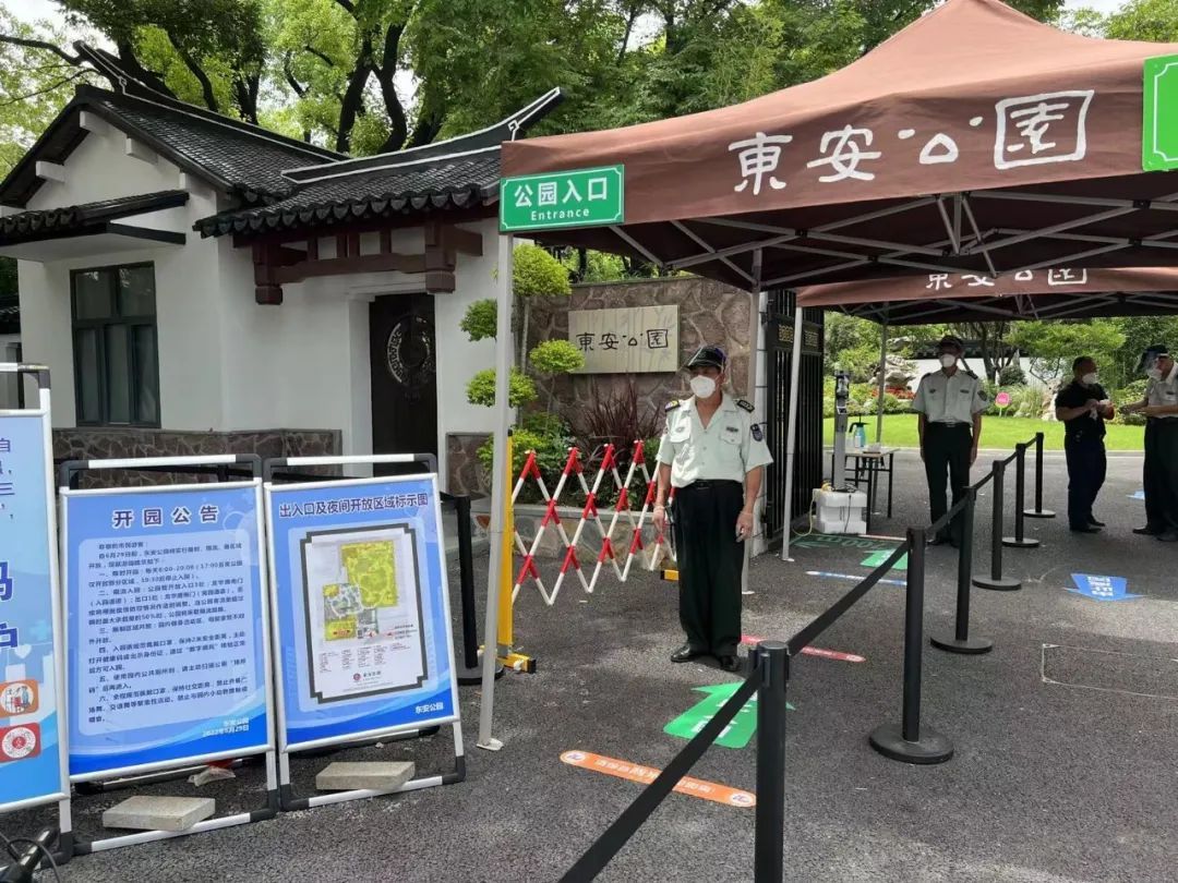 记者来到东安公园,看到公园在位于龙华路的南门处设置了“数字哨兵”,并安排了多名保安在入园口协助游客进行核酸检测证明的查验,提前提醒游客打开随申码,确保“应检尽检 有序入园”。在查验点位前方,园方还醒目地摆放了开园公告和开放区域的示意图等,让游客一目了然。