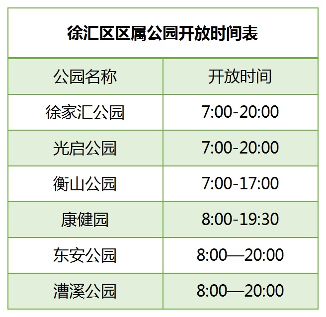 根据区绿化部门信息,目前,东安公园和漕溪公园开放的具体时间为8:00-20:00,最后入园时间和夜间开放区域以园方公告为准。其余区属公园调整后的开放时间也已经更新,游客游园可参考下表: