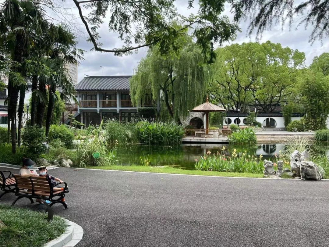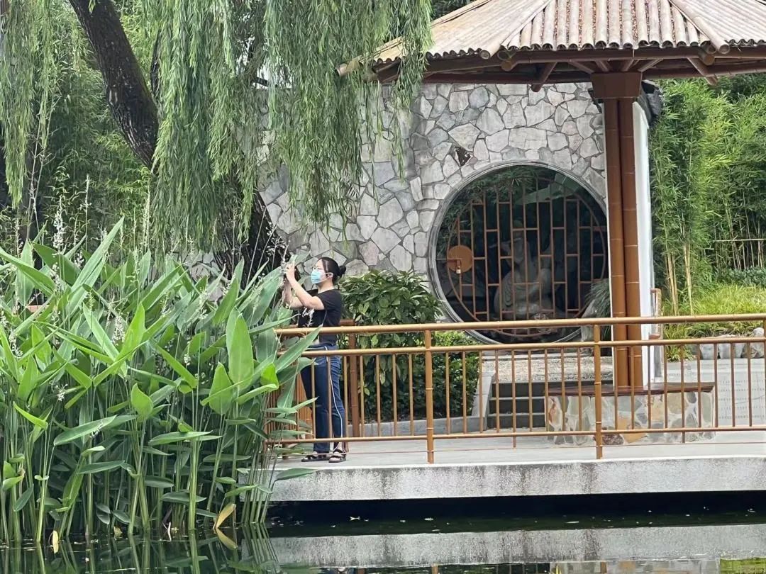 记者发现,虽然下午的天气稍显炎热,但仍不时有游客扫码入园。游客主要是住在附近的居民,绝大多数是“老人带娃”的搭配,也有上了年纪的夫妻,独自散步的女青年……三三两两,都能拉开较大距离。公园的水池边可以说是最受欢迎的景观位了,清澈的池水和多样的水生植物不仅深受孩子们的喜爱,更是游客们拍照打卡的好布景。