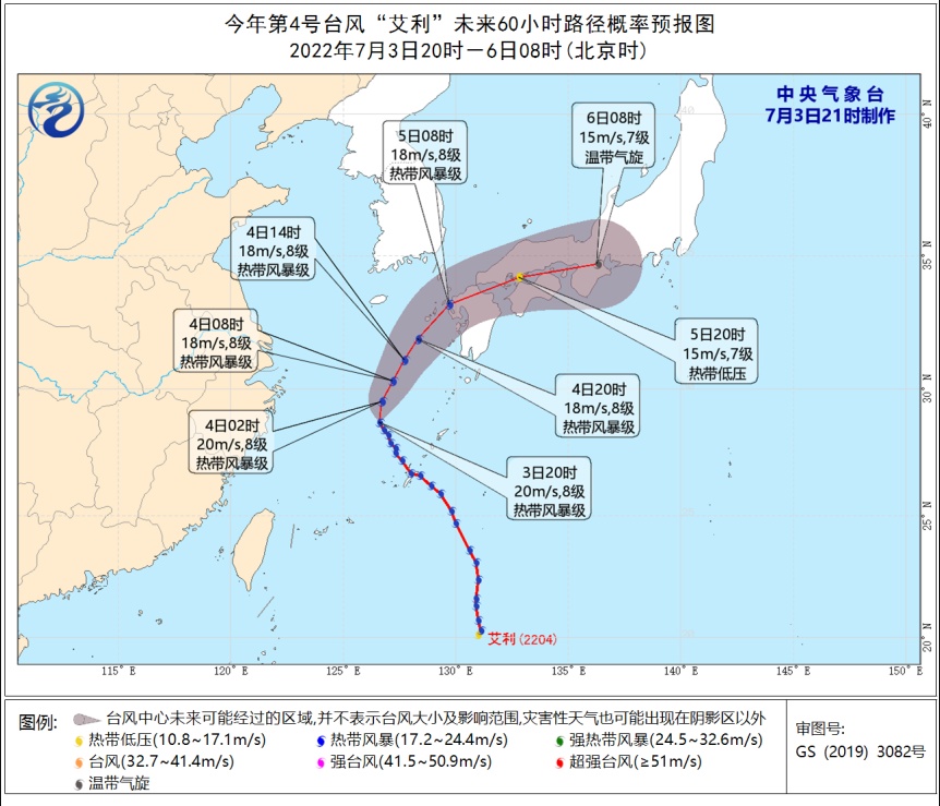 今年第4号台风“艾利”(热带风暴级)于2日夜间移入东海海域,3日17时27分其中心位于距离日本冲绳县那霸市北偏西方向约255公里的海面上。