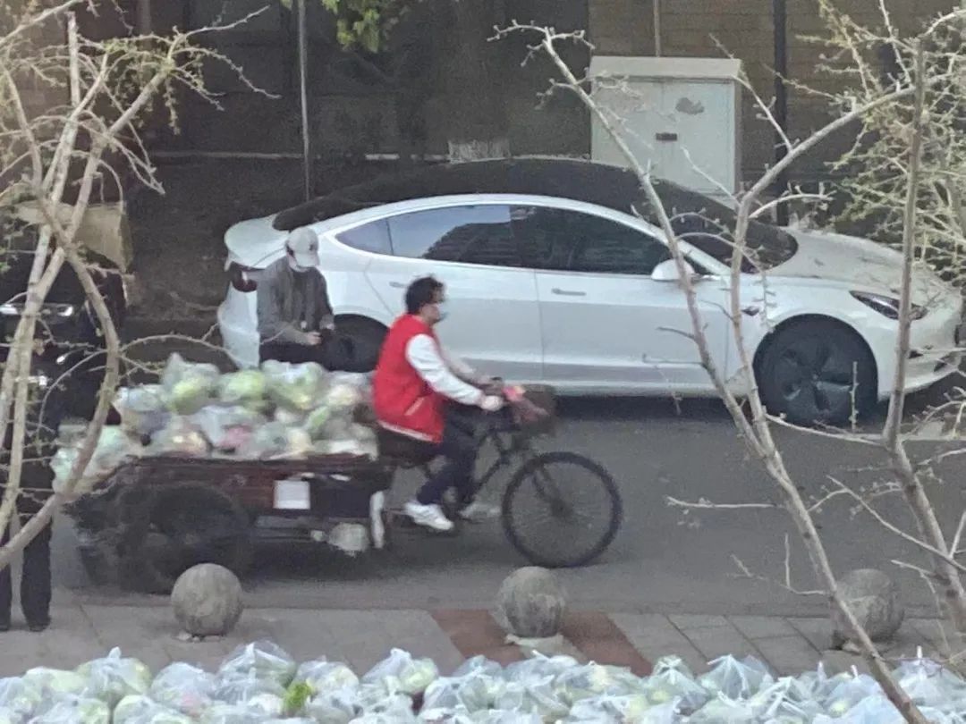 一位居民看到张旭骑着一辆三轮车发放物资,货箱内整整齐齐垫着硬纸板,问他哪来的纸板,他说,专门去找纸箱拆出来的,三轮车有点旧,希望居民们拿到干净的物资。