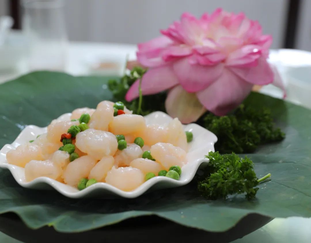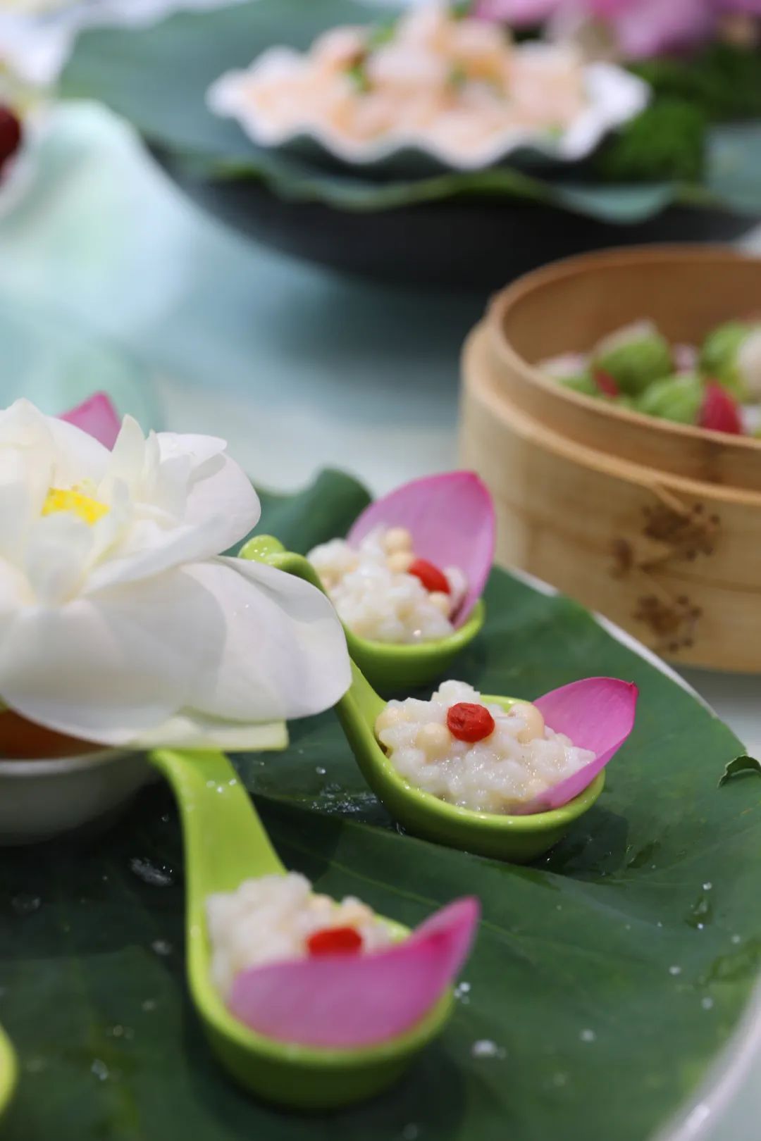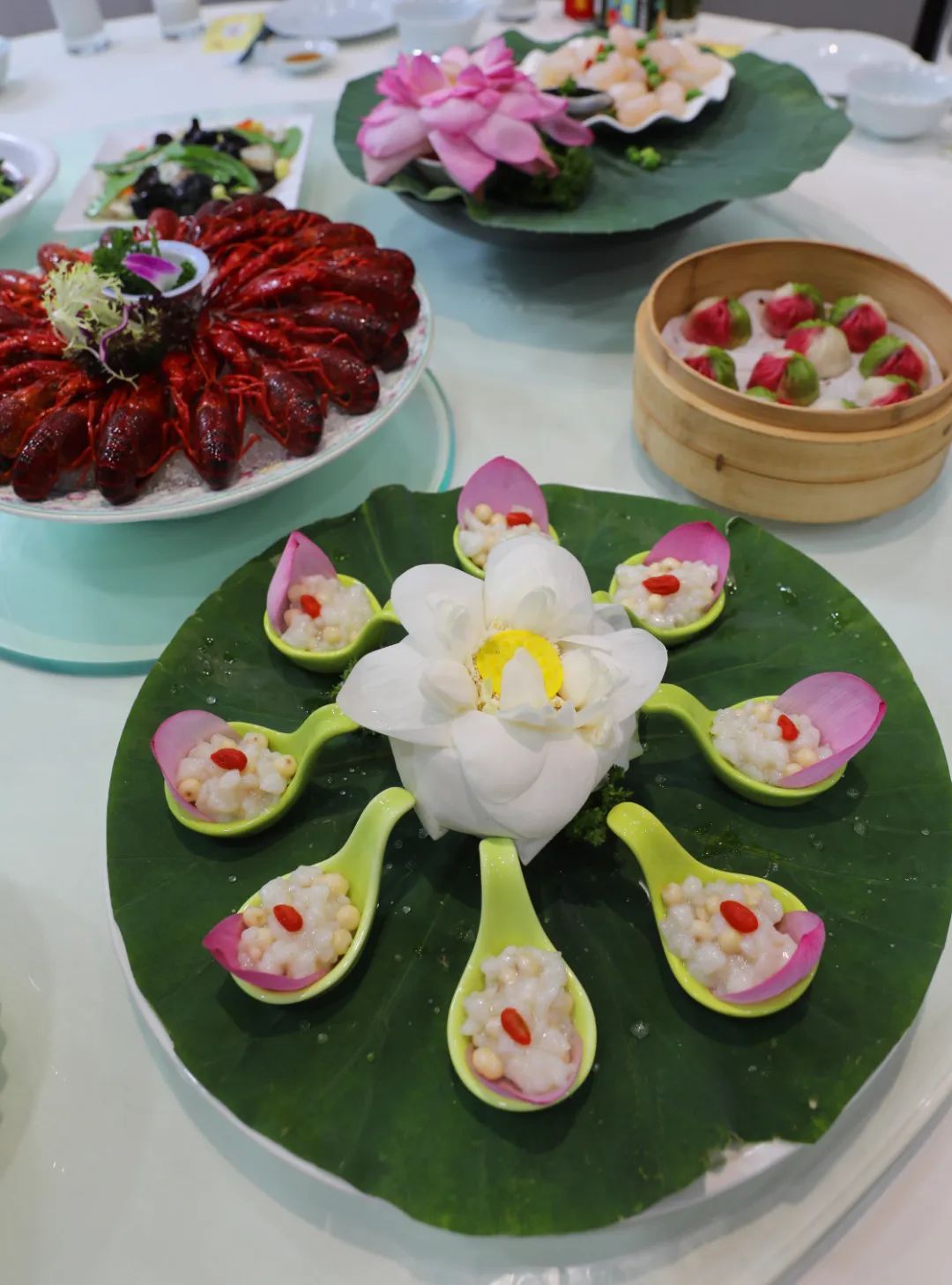 荷花一身都是宝,它的根、叶、花、果其实都可以入膳。荷花宴中的荷花、荷叶都是当天新鲜采摘的,菜品中用的嫩藕是专门从山东采购的马踏湖白莲藕,比普通莲藕更脆爽鲜嫩。