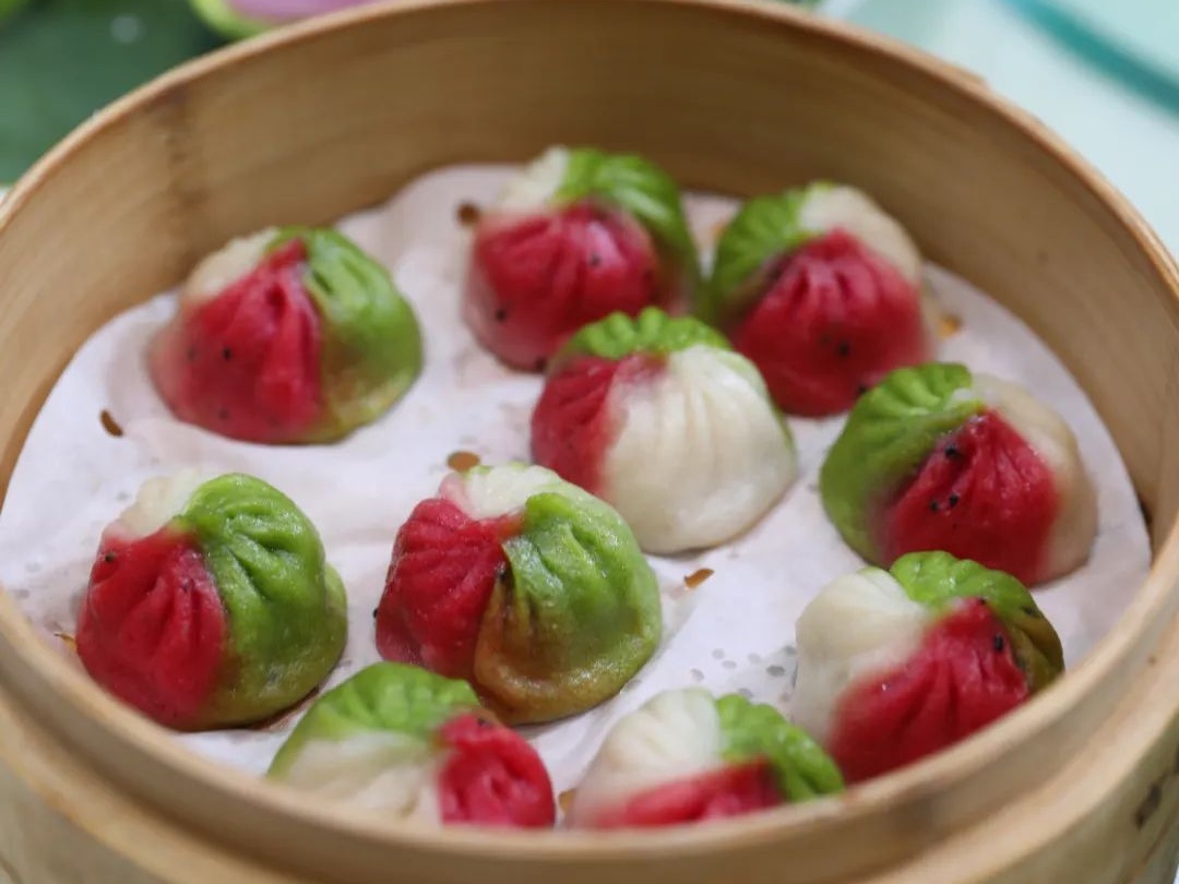 将荷花与南翔小笼技艺完美结合的,当属“荷藕三色小笼”。每一枚小笼皮都包含红、绿、白三种颜色,红色面坯中加入了火龙果汁,绿色面坯中加入了菠菜汁,肉馅里还混入了清脆爽口的藕粒,一枚入肚,仿佛连暑气也跟着消散了。