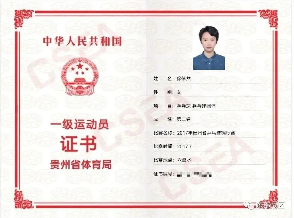 徐依然获得的乒乓球一级运动员证书。