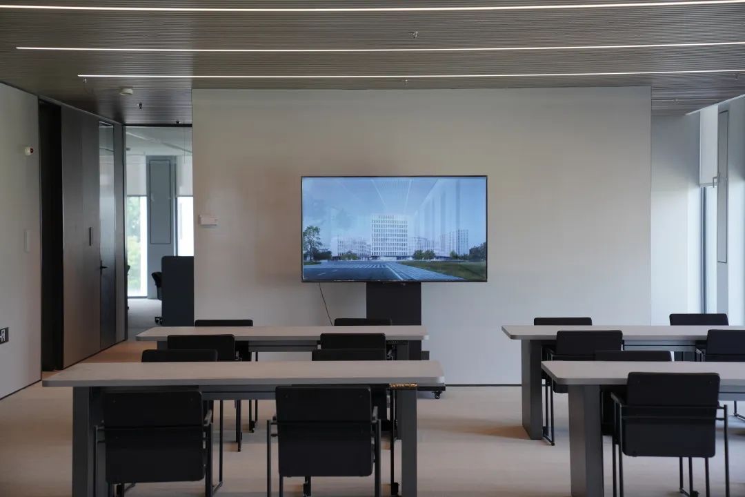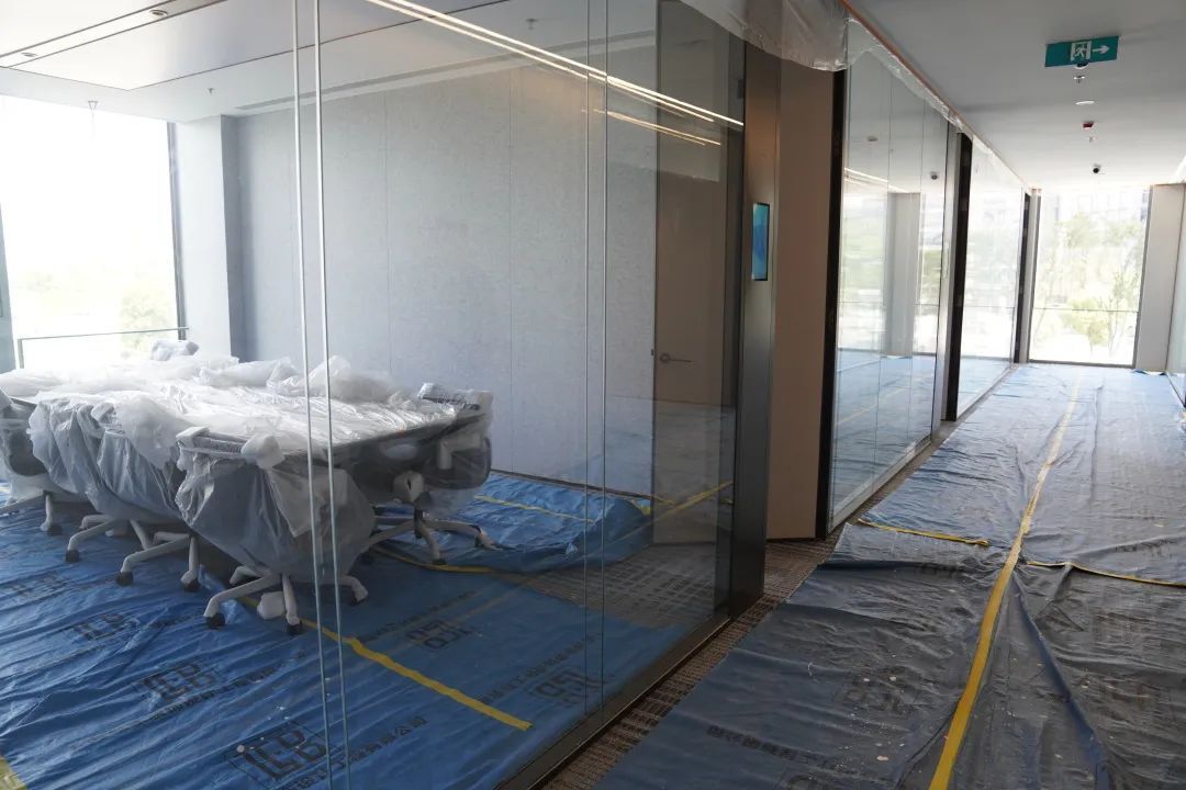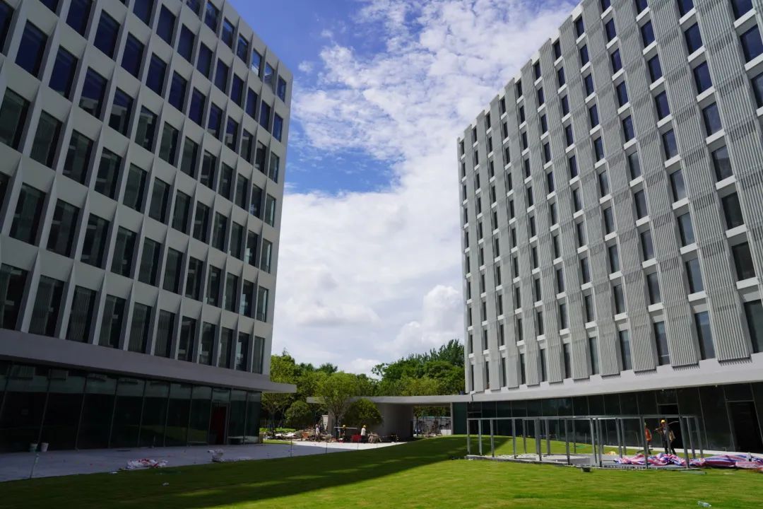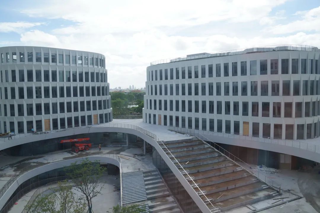 小嘉在施工现场看到,研发总部大楼由5栋塔楼环绕而成,中心位置为下沉式广场。建筑的主体和外立面已全部完成施工,工人正在加紧进行内部装修。