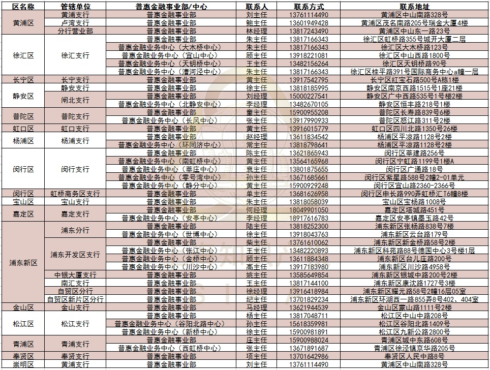 中国银行上海市分行各普惠中心联系方式