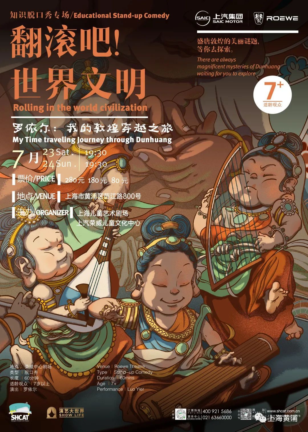 7月23日至24日,“大鲸鱼剧场”全新策划的《翻滚吧!世界文明》艺术脱口秀将“首演”。剧场邀请了艺术脱口秀创始人罗依尔,从敦煌莫高窟出发,用语言的艺术将敦煌中的力量与美转化为易于青少年接受的讲解,深入浅出,在欢声笑语中理解其中意蕴。