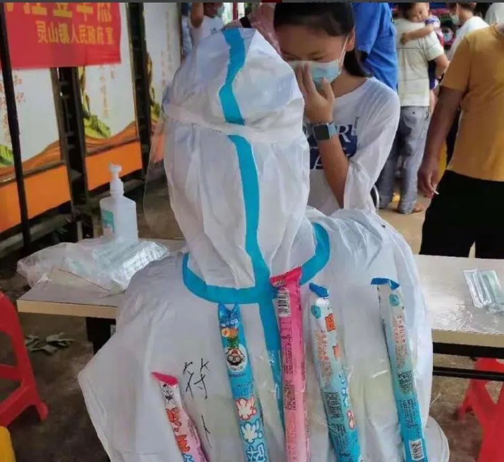△炎炎夏日,坚守抗疫一线的医护人员“背冰”上阵。