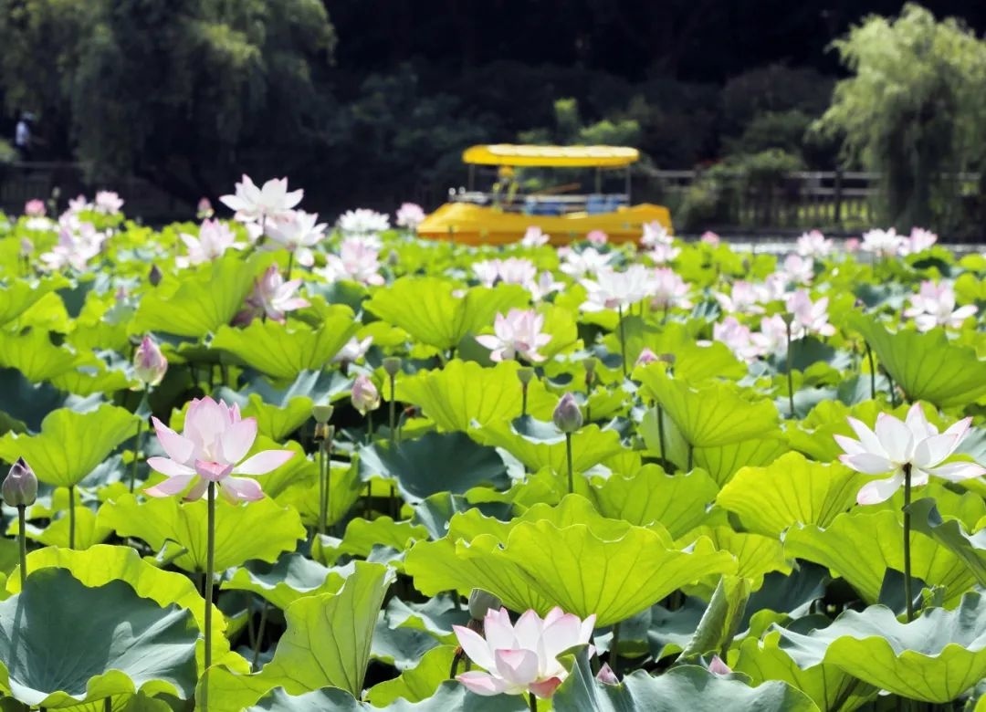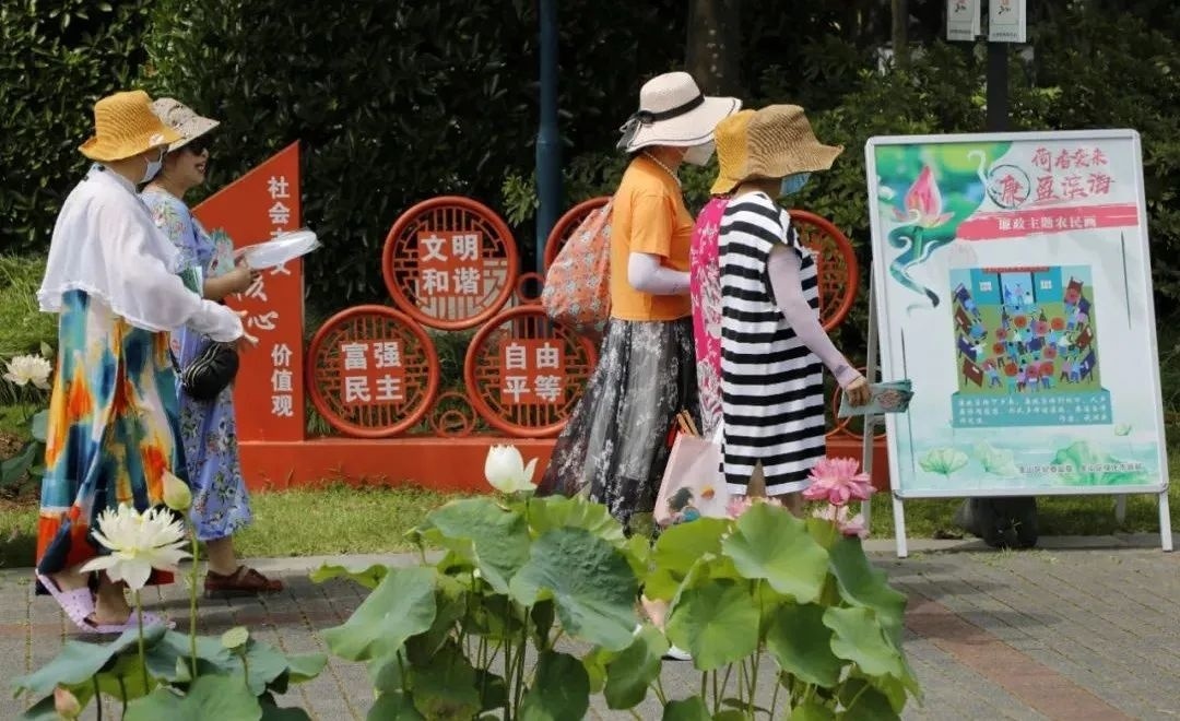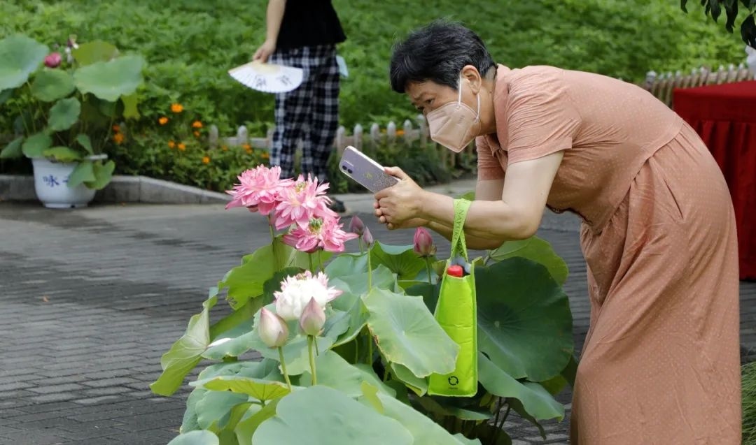 作为此次荷花节的主会场,滨海公园共展出5个品种300多盆缸栽荷花。除了赏荷,市民游客更能现场体验荷花扇面绘制、廉政书法及科学防疫知识问答等丰富的游园打卡活动。