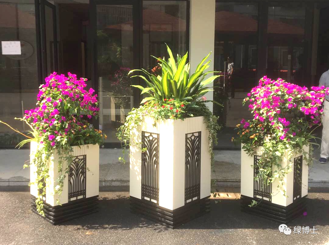 在面对桶式花箱、马鞍式花箱、立体花箱等不同样式的花箱时,会采用不同的种植手法进行布置以达到和谐美观的效果。
