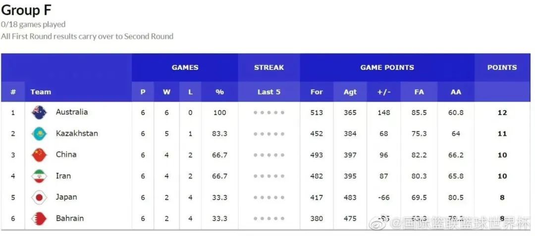 随着2023年男篮世界杯亚大区预选赛第一阶段的比赛全部结束,第二阶段的分组也随之产生。根据预选赛第一阶段的成绩,4胜2负的中国男篮与伊朗队同积10分,分别暂列F组的第三、第四位。暂列F组前两名的分别是澳大利亚队(6战全胜)、哈萨克斯坦队(5胜1负),后两名是日本队和巴林队(均为2胜4负)。E组的6支队伍是:新西兰队、黎巴嫩队、约旦队、菲律宾队、沙特阿拉伯队、印度队。