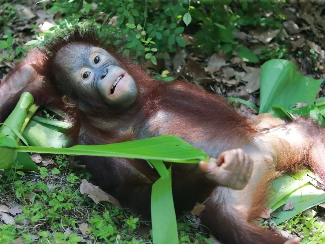 透过枝丫,斑驳的阳光撒在猩猩庆庆身上,远处瀑布带来混着水汽的阵阵凉风。猩猩“庆庆”拿着芭蕉叶躺在树下,撸串般享用着用凉水浸过的芭蕉叶。