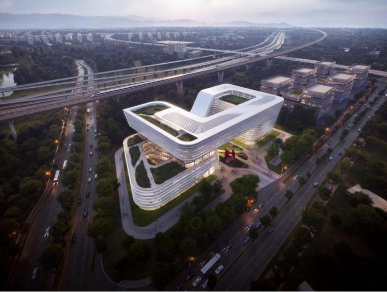 该项目位于虹桥国际中央商务区闵行片区天山西路与申昆路交叉口西北侧地块内,占地面积约2.22公顷,总建筑面积71000平方米。建筑以“超能云环”为设计意向,以整体连贯形态融合覆盖市域铁路调度指挥、运营办公、技能培训多重功能,营造“超能”概念。在环形建筑中枢开展海量数据传输处理,打造“云环”意向,高品质集中体现虹桥国际中央商务区建筑风貌。