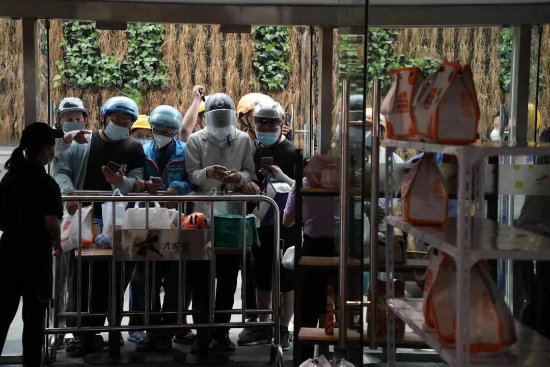记者在静安一家商场外卖取餐点看到,前来取餐的外卖小哥大多“全副武装”。在等餐的间隙,有的小哥摘下头盔擦了擦脸上的汗珠;有的摘下墨镜,能看到脸部晒得通红;有的靠近商场的冷风口喝水休息。