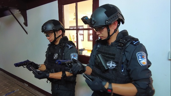 特警队员两两分组,相互配合进入预设有多名携带凶器的暴力犯罪嫌疑人隐匿其中的封闭场地。