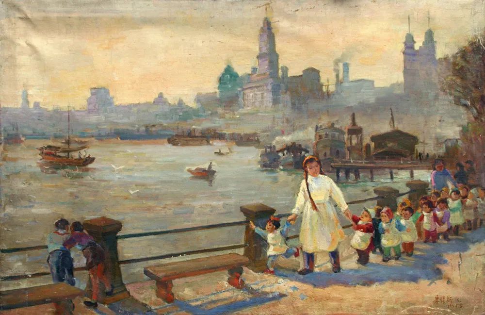某天黎明的晨曦中,外滩街道旁一队活泼可爱的幼儿园小朋友,在老师的带领下从黄浦江边走过,背景是外滩的建筑群。这片刻时光被朱怀新用画笔记录下来成为永恒。再看如今外滩,早已旧貌换新颜,已成为一座国际大都市。