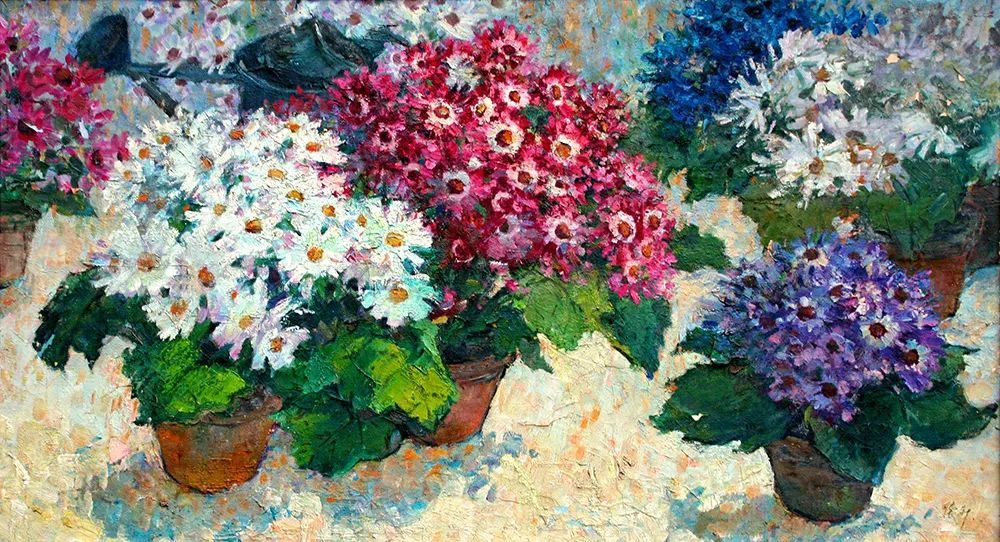 这个时期除了西画之外,朱怀新开始尝试国画的创作。她的国画题材多为各类花卉,和油画一样,笔触奔放,类似于泼彩手法,可以说是画家晚年的新尝试。