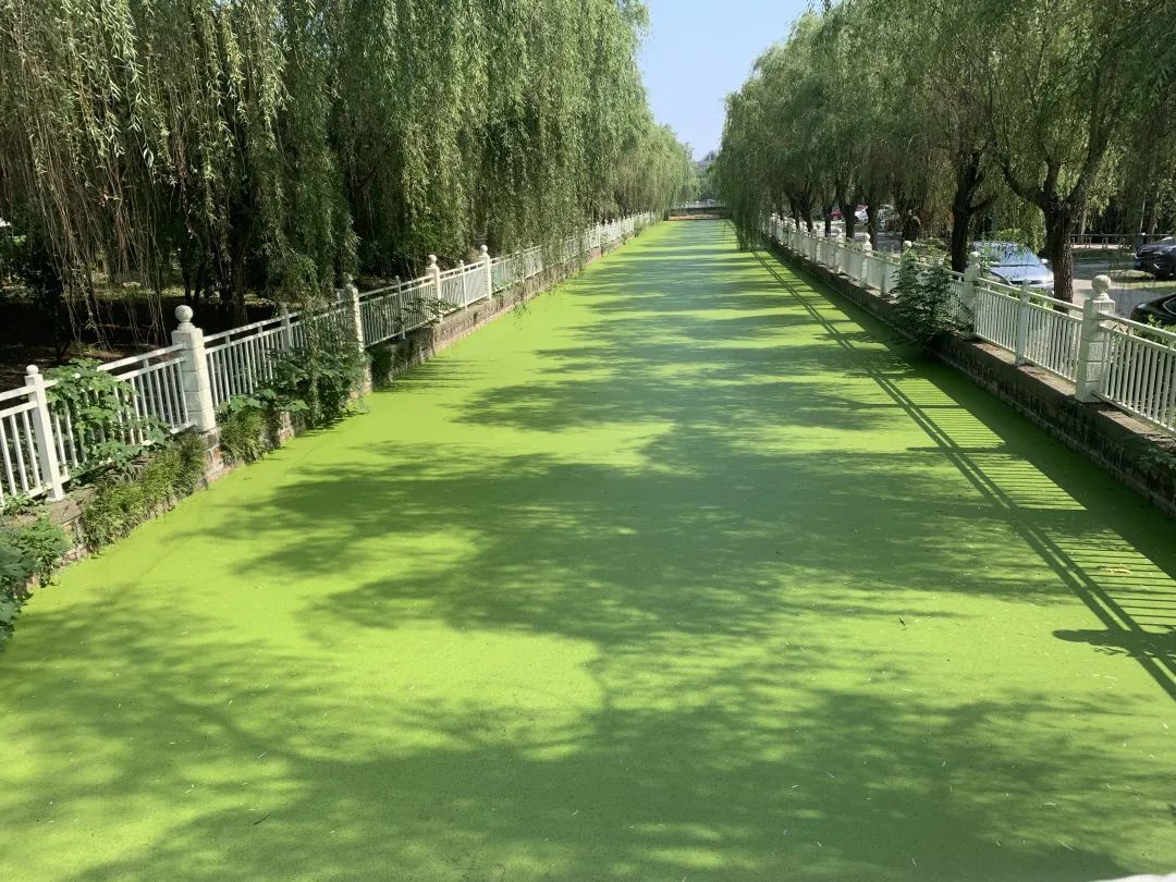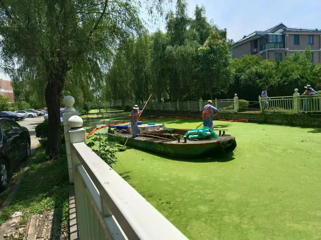 中桥港是一条流经方松街道润峰苑小区的河道,由于河道宽度只有十几米,大型打捞船难以驶入,环卫工人只能下放作业筏开展人工打捞。他们身着救生衣、下水裤,通过架设移动围油栏的方式,将绿萍慢慢收集起来。同样,大邱泾的部分河段位于上海外国语大学校园内,大型打捞船无法进入,也只能靠人工打捞。