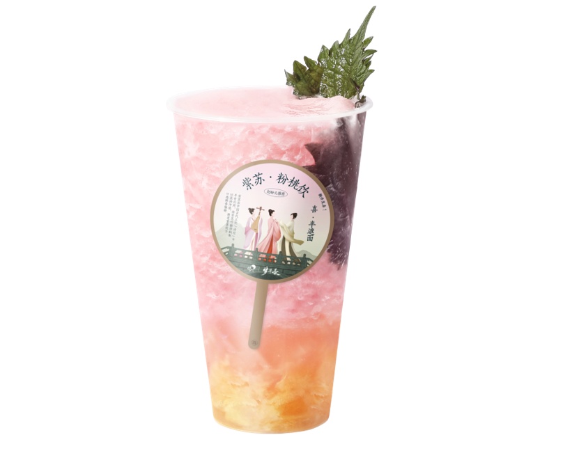紫苏·粉桃饮灵感来自于剧中的“紫苏饮子”,商家将紫苏元素与水蜜桃进行搭配,打造现代版紫苏饮风味,让观众可以通过品尝产品,感受《梦华录》中的茶饮魅力,了解茶文化。