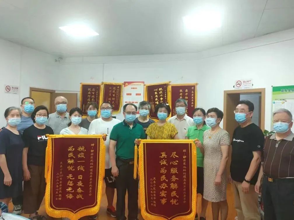 7月5日,天东小区的业委会和志愿者代表将印有“抗疫一线日夜奋斗,为民解忧无怨无悔”“尽心服务解民忧,真诚为民办实事”的锦旗送到北站街道高寿里居委会工作人员手中,与锦旗一同而来的,还有居民张焕苏为高寿里居委全体工作人员写的一首感谢诗词。