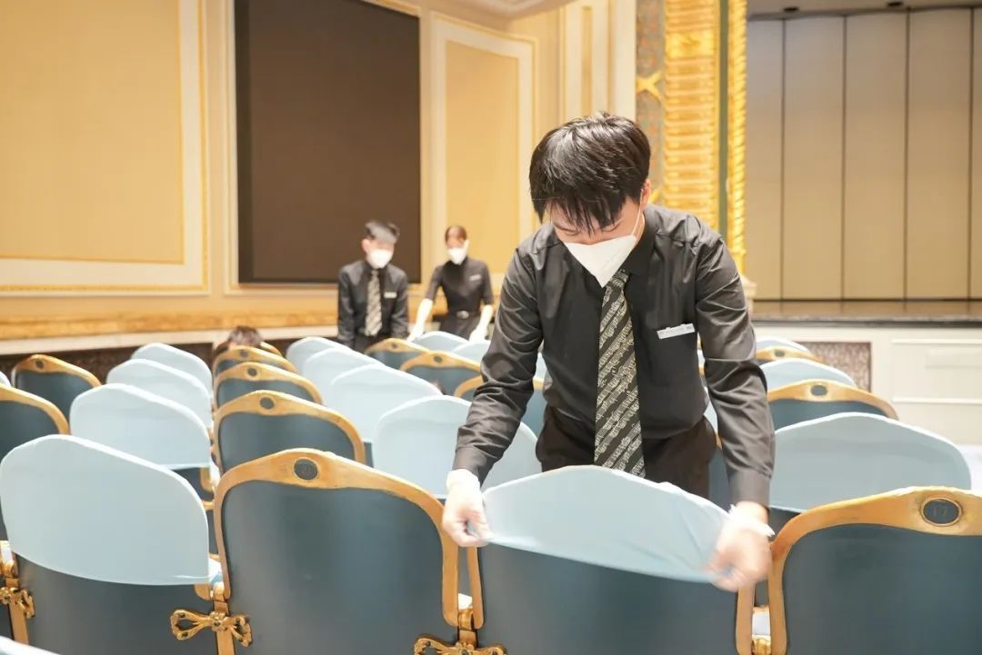 剧场服务人员为间隔座位套上椅套