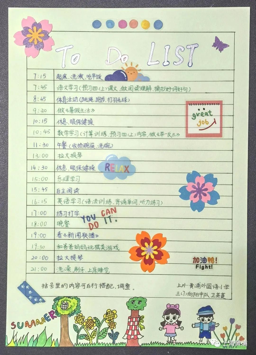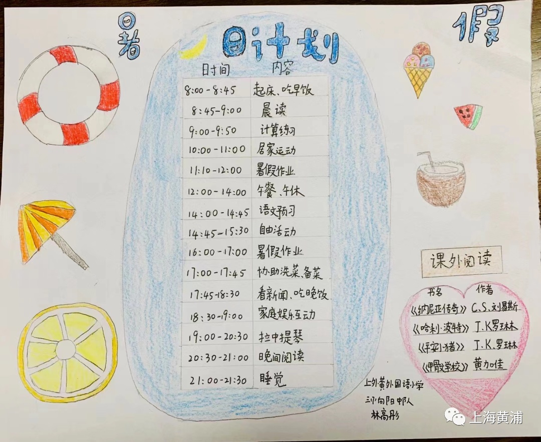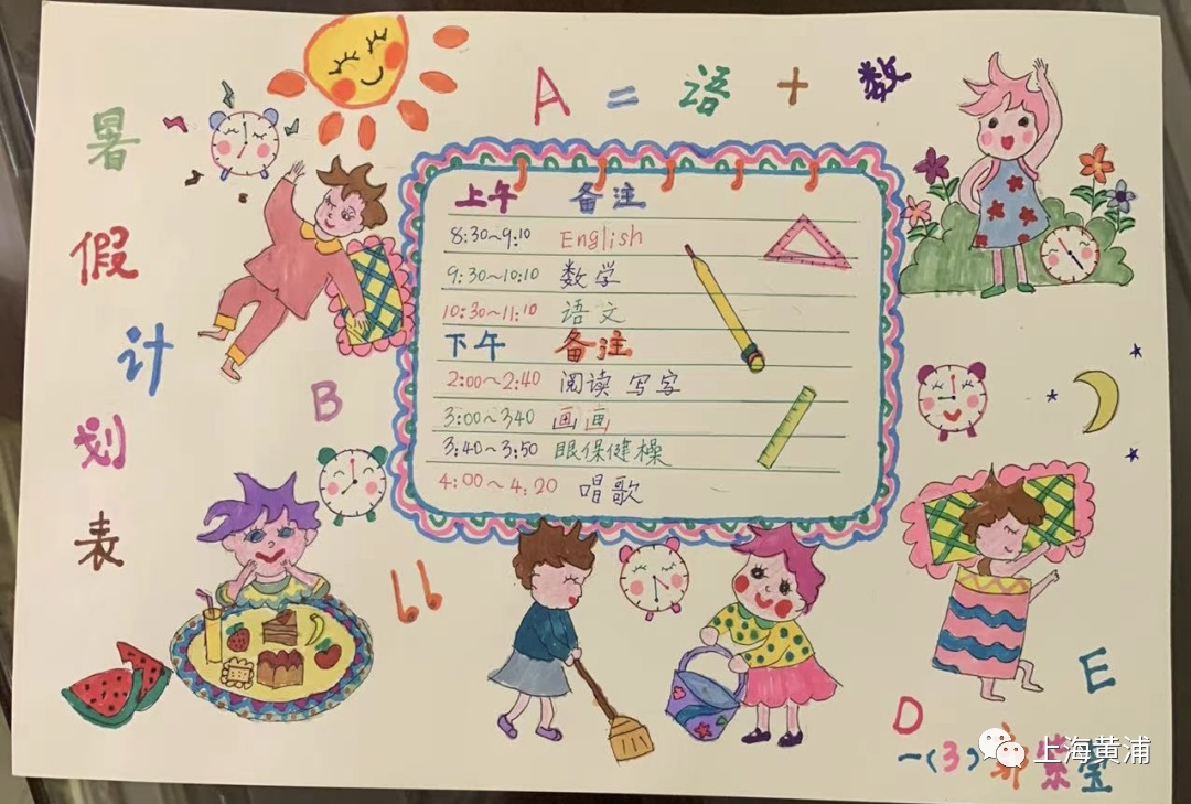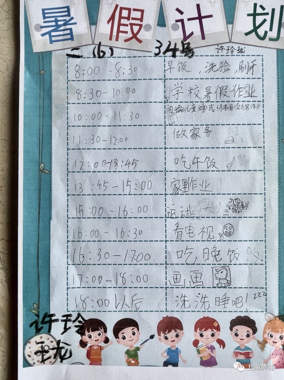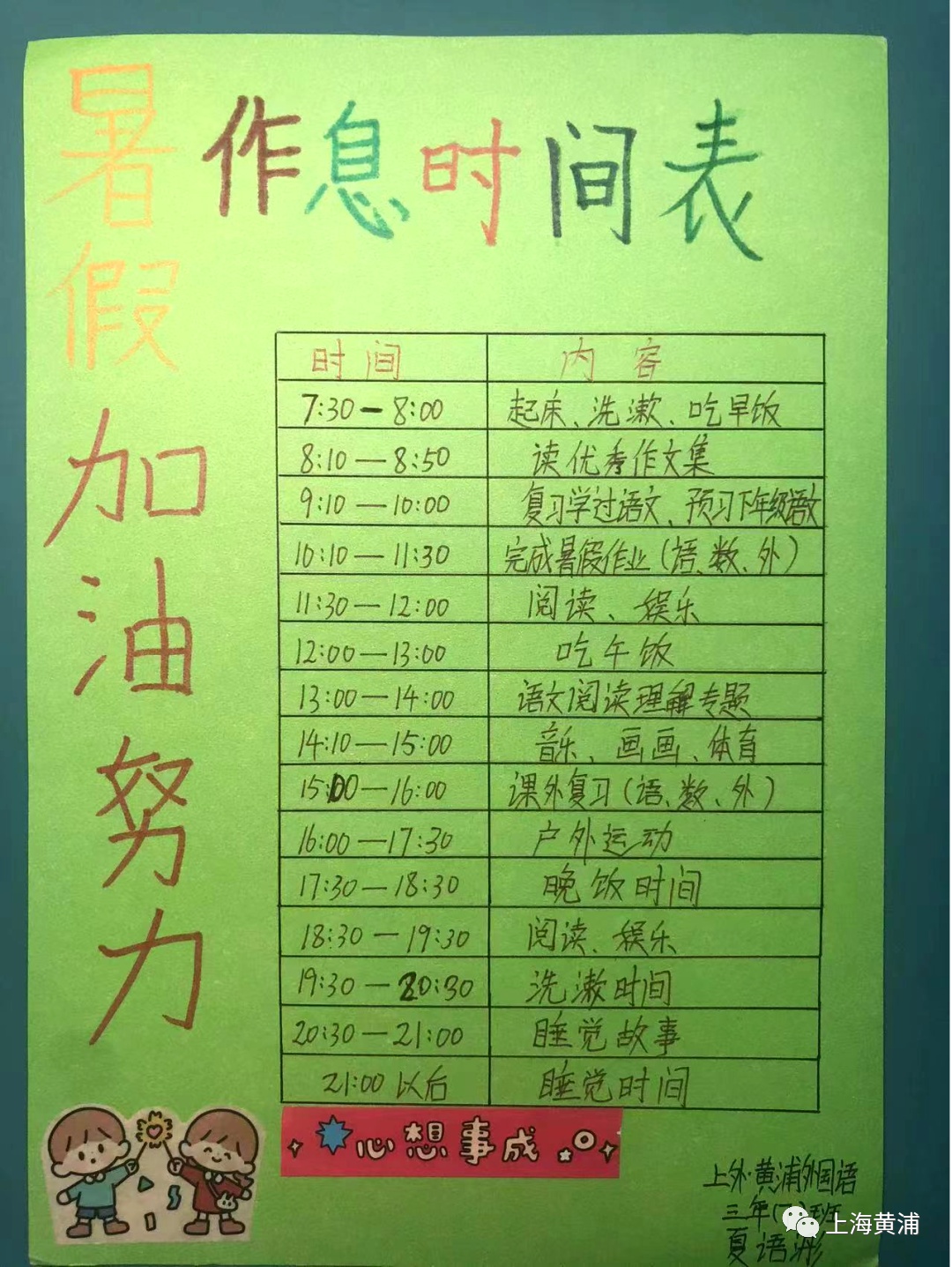 暑假已经如期而至,为了让学生们度过一个欢乐又有意义的假期,上外黄浦外国语小学组织同学们自制暑期生活计划表,孩子们按照各自的喜好认真的完成时间表的制作,以此提醒自己假期里仍要保持良好的生活作息规律,张弛有度。一起来看看学生们用心制作,各式各样的暑期时间表吧。