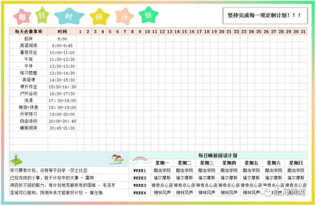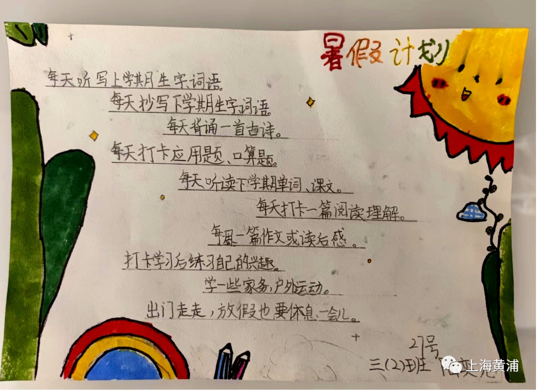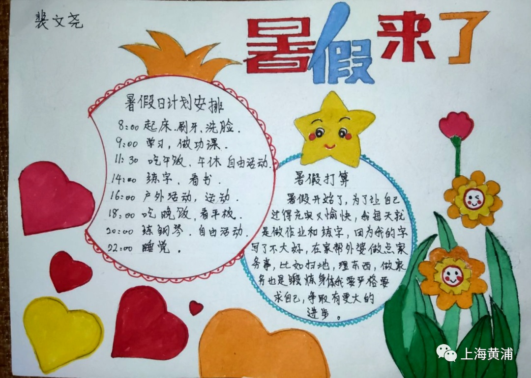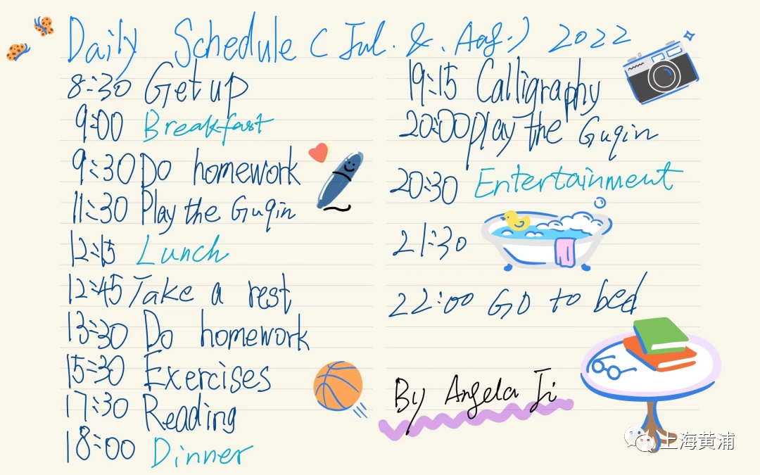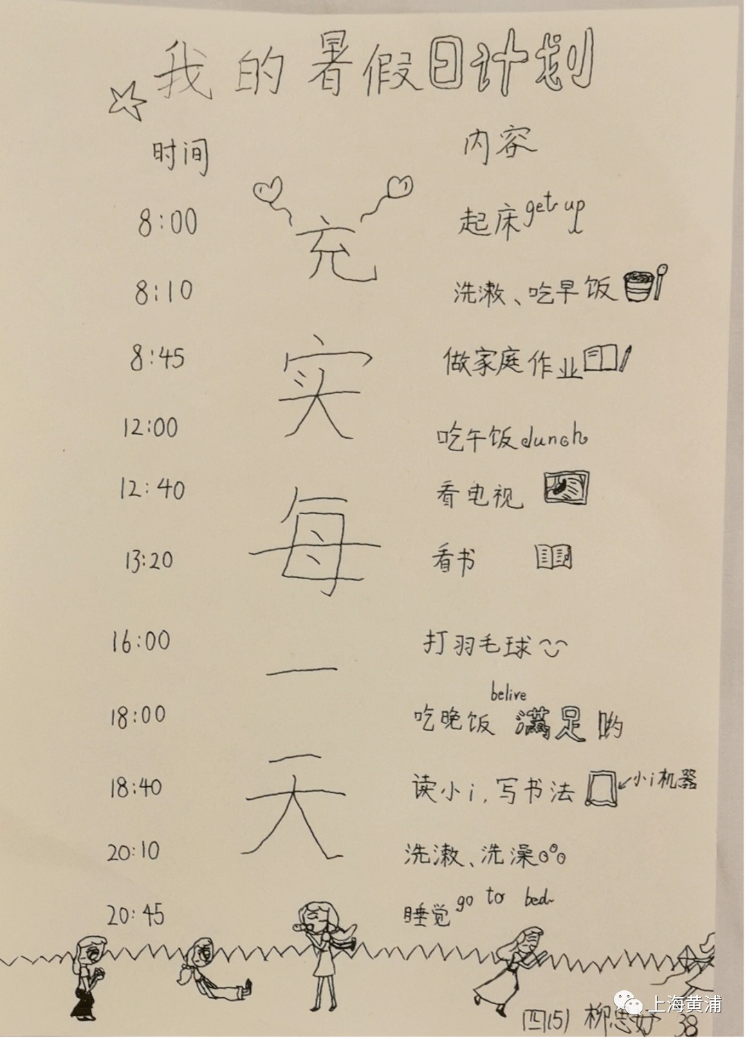 暑假已经如期而至,为了让学生们度过一个欢乐又有意义的假期,上外黄浦外国语小学组织同学们自制暑期生活计划表,孩子们按照各自的喜好认真的完成时间表的制作,以此提醒自己假期里仍要保持良好的生活作息规律,张弛有度。一起来看看学生们用心制作,各式各样的暑期时间表吧。