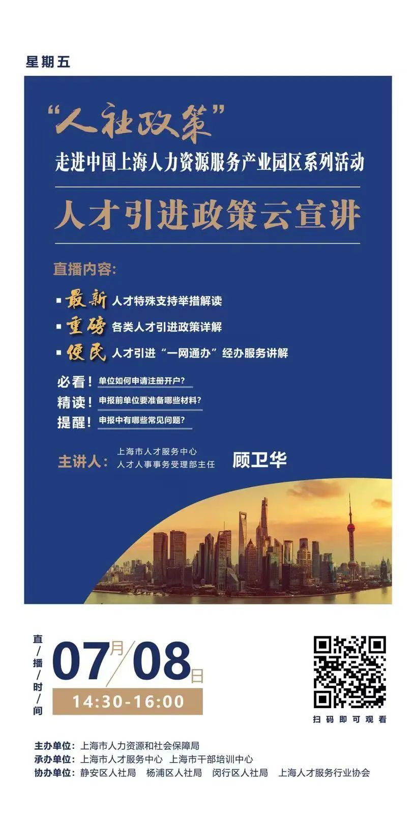本期宣讲活动于7月8日(周五)下午14:30举办,采用在线直播方式,重点聚焦本市人才引进政策和经办流程。