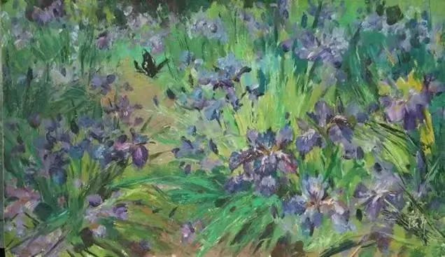 这两幅作品采用近距取景,构图饱满紧密,雏菊样的花束呈扇形填满画面,显得生机勃勃,花枝前后掩映、高低错落,穿插安排得别致、生动。画面用色厚薄相宜,花卉颜色厚涂,重叠勾绘的细长色线,形成花瓣蓬松层叠的效果,画家采用印象派绘画保留笔触,以及用笔触呈现光影微妙动态的手法,通过笔触的轻重、浓淡、徐疾,在点画出光影迷离的花束时也呈现了画者内在的情绪状态。