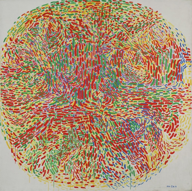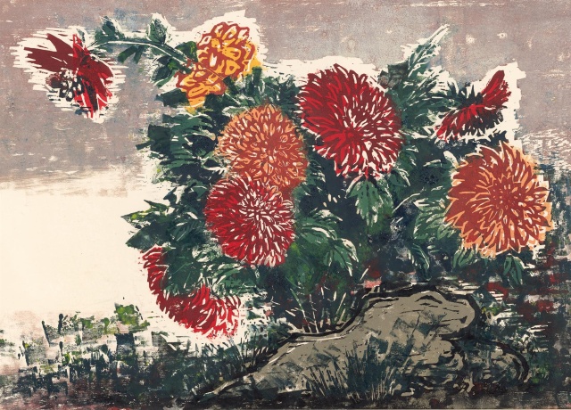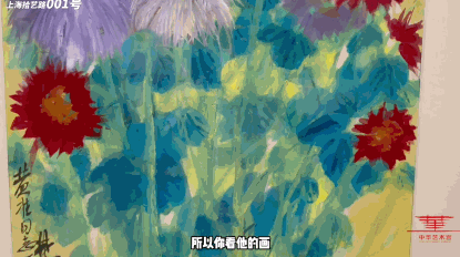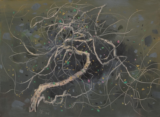 在“芳菲无尽”展览中,与之比肩的还有吴冠中的两幅作品:《野花闲草》、《点线迎春》。其中《野花闲草》以中国画的抽象形式,描绘了野外花草的视觉景象。整幅画面以水墨渲染作为背景,墨色层次变化丰富,意境幽深。油画作品《点线迎春》则描绘了一棵充满活力的树,画中纷飞乱舞的树枝构成了未加修饰的大自然,却又乱得恰到好处。