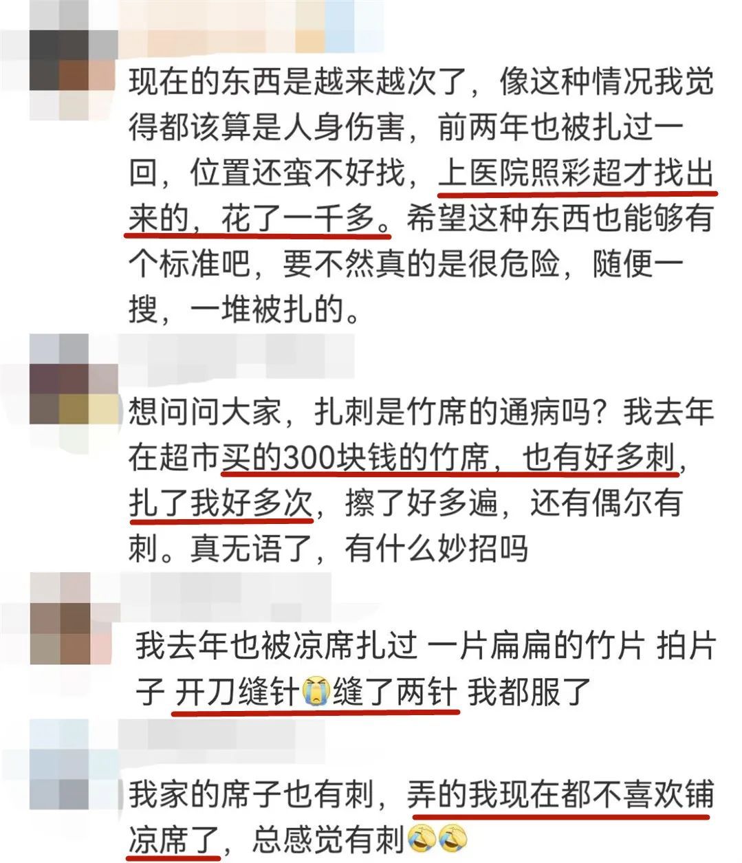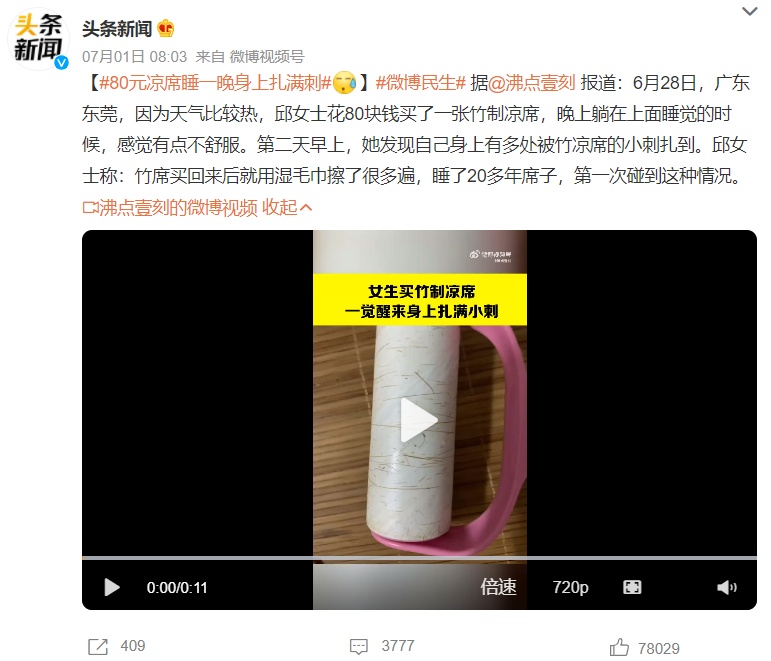 一女孩花80块钱买的竹制凉席,睡上去一觉醒来,身上多处被凉席的小刺扎到,秒变“大型刺猬”。