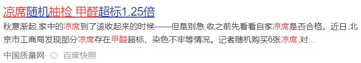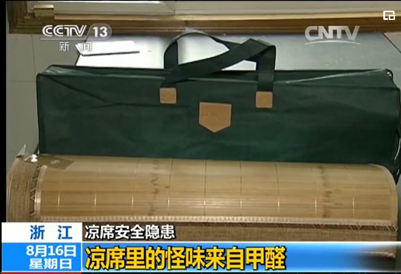 国家标准明确规定,甲醛释放量(空气里人能够呼吸、感受到的量)要小于1.5mg/L,在浙江一次抽检过程中,一凉席甲醛超标了10倍以上。