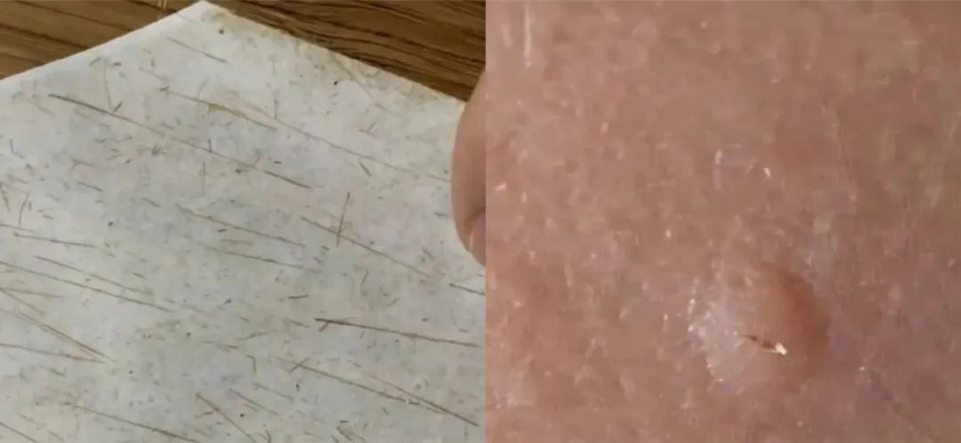 视频中,滚过这张竹席的粘毛器,能明显看出粘满了毛刺,女孩的皮肤也被毛刺扎伤,看着又疼又痒。