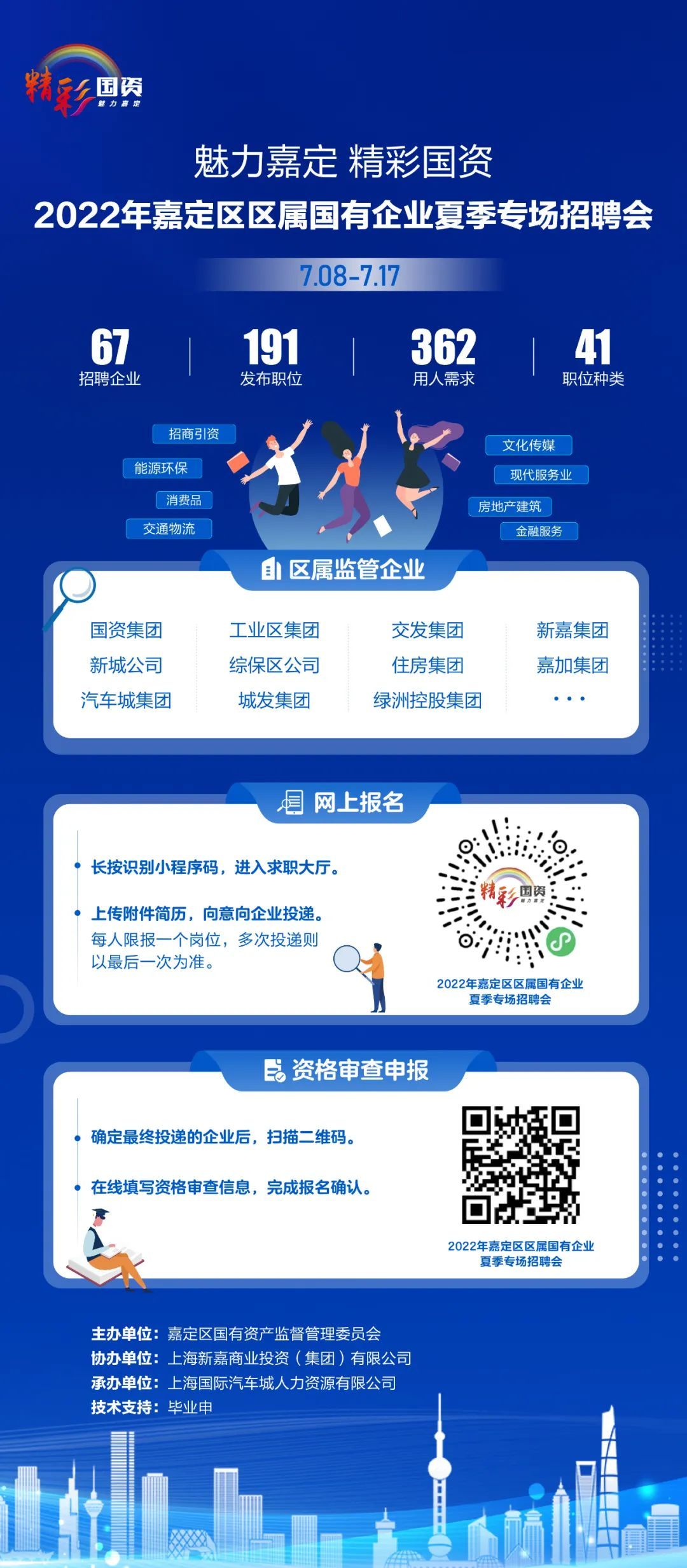为认真贯彻区委、区政府关于加强区属企业员工招聘管理的要求,根据《嘉定区区属国有企业员工招聘管理办法》,区国资委拟于近期举办2022年嘉定区区属国有企业夏季招聘工作。现将有关事项公告如下: