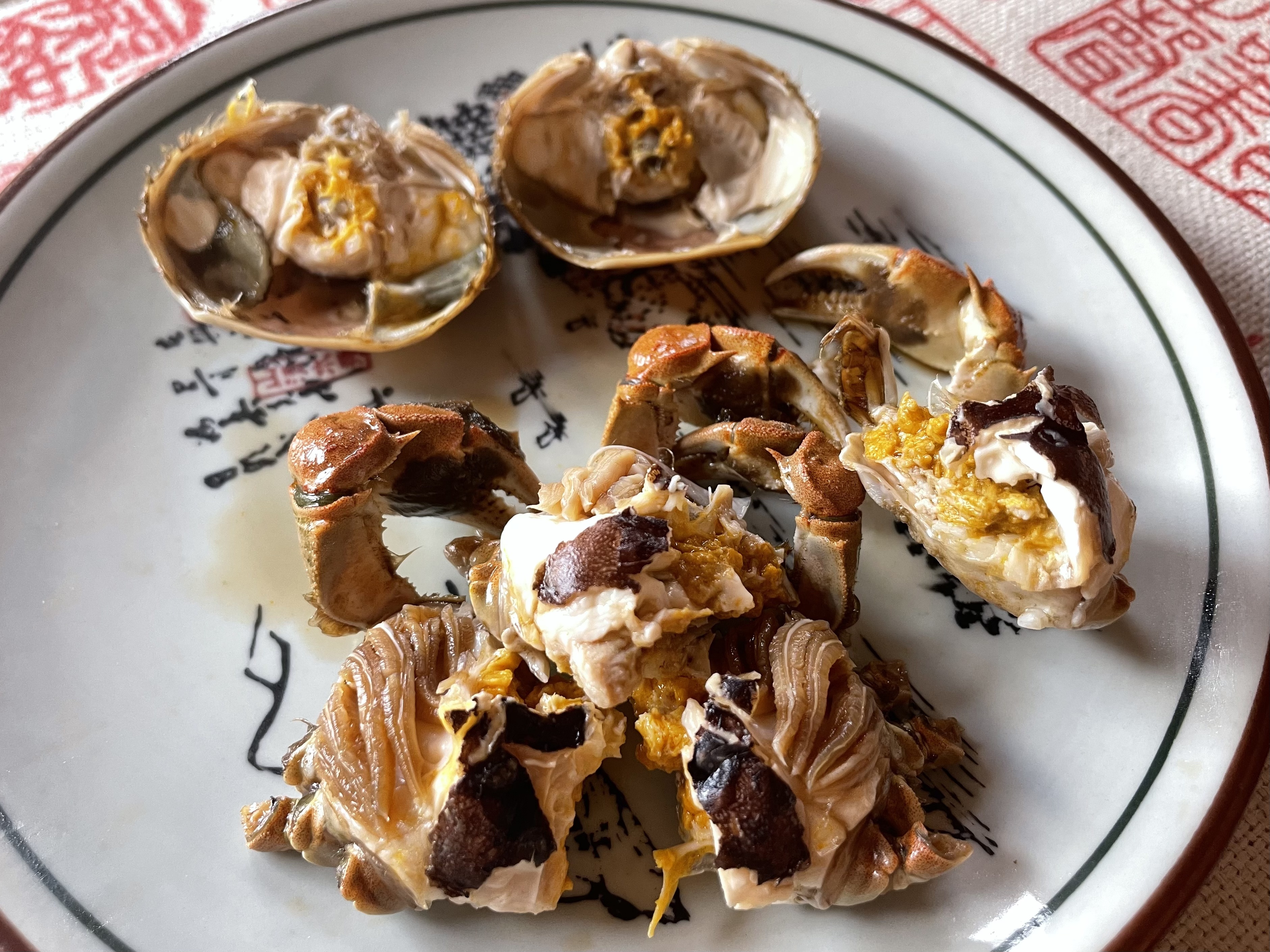 所谓“六月黄”,即指“童子蟹”,河蟹一生中有十多次蜕壳,每次蜕壳都是一次成长,“六月黄”是其进入成熟期前最后一次蜕壳,亦是从“少年”步入了“青年”,经过此次脱壳的雄性“童子蟹”体重一般在100克左右。“‘六月黄’是雄蟹里的‘小鲜肉’。”戚敏霞形容道,“六月黄”蟹身较小,壳薄肉嫩,如果用手捏一下蟹爪,还会感到软软的回弹力,蟹膏呈金黄色流质状,口感软滑甘美。