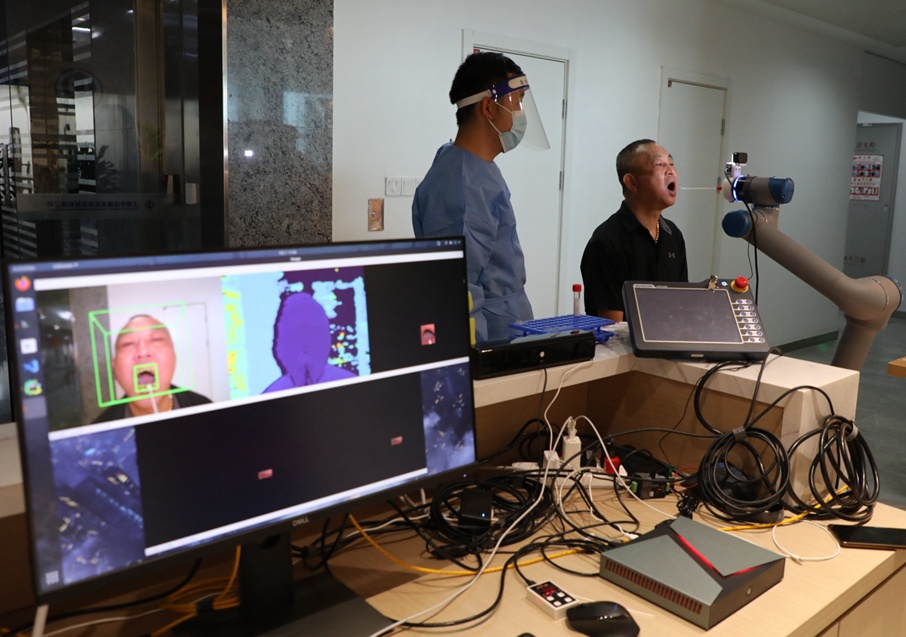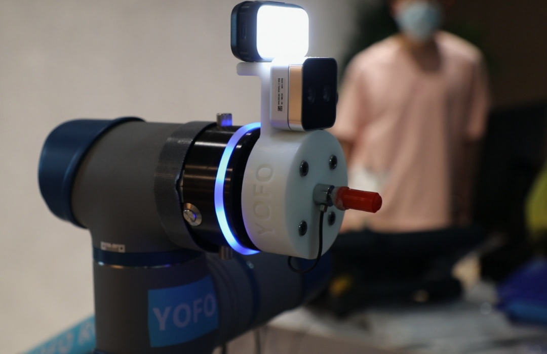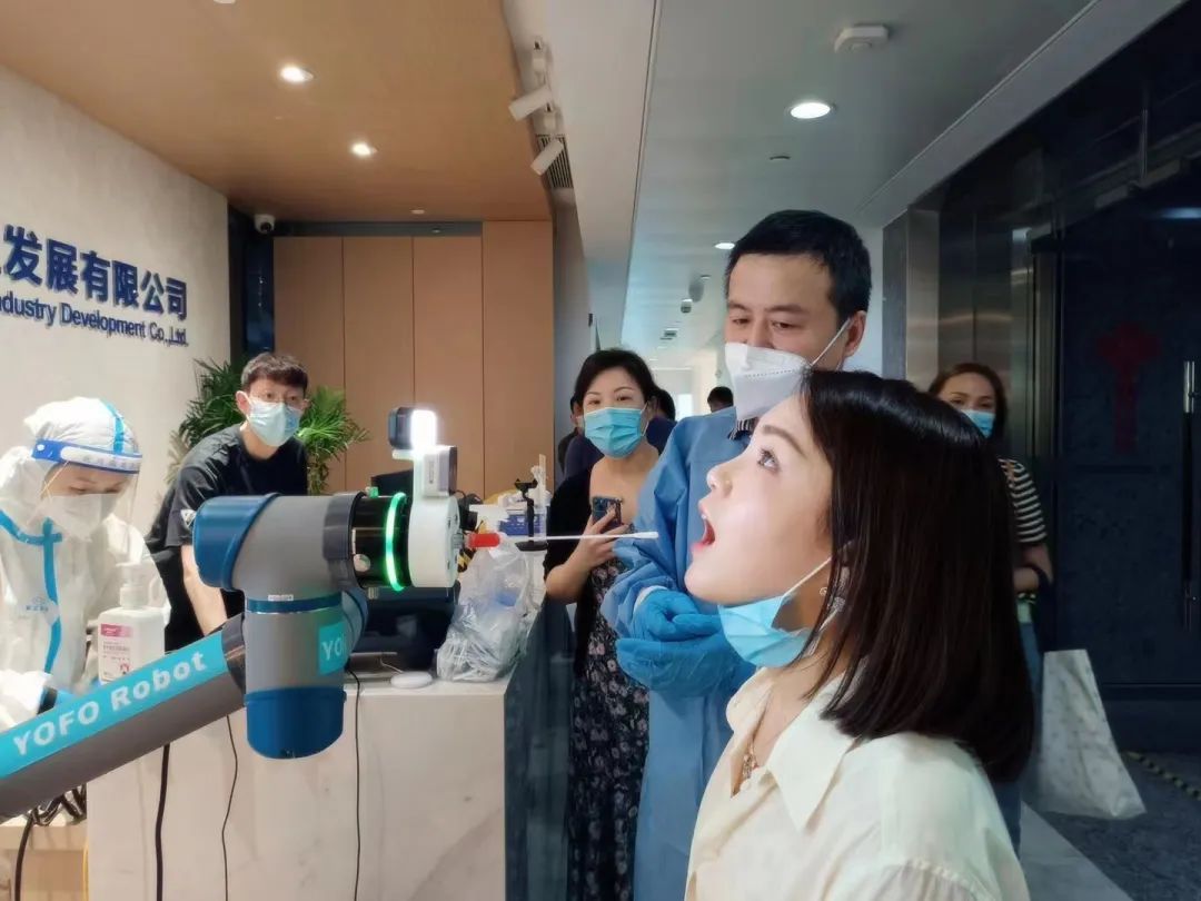 设备的研发单位上海优复博智能科技公司负责人孙振峰博士告诉记者:“这款机器人依托于公司自主研发的智能机器人核心算法集和系统软件——yofoAIROS,综合了人工智能视觉和力控混合感知控制技术,可以精准识别人脸部动作,隔空判断并定位到采样者的口腔位置,全程无需接触辅助器材。每次采样之前,人工助手进行手部消毒、空气喷雾消杀,并且采用便携式紫外消毒器对机械臂进行定向紫外消杀,过程中机械臂(头部)自带紫外消杀功能,既提高了采样的安全性,也增强了采样者的体验感。”