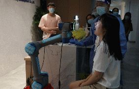 据孙振峰介绍,智能核酸采样机器人可以24小时无间断工作,能够有效降低人工采样的风险和人力成本,缓解采样“大白”的工作压力。采样工作者在闷热的环境下身穿防护服,很容易产生疲劳,而机器人不需要休息,每一次动作都是规范的,可以满足大规模高负荷的核酸采样需求。