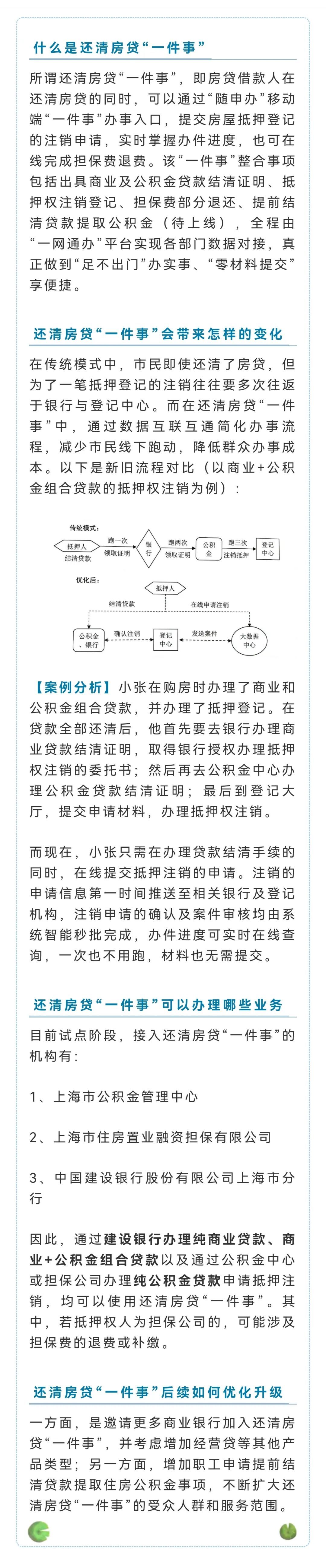 市规划资源局联合市大数据中心、市公积金管理中心、市住房置业担保公司以及建行上海市分行,推出还清房贷“一件事”服务新举措,即不动产抵押登记“不见面办理”3.0升级版,解决市民办理房产抵押注销往返跑难题。详见↓