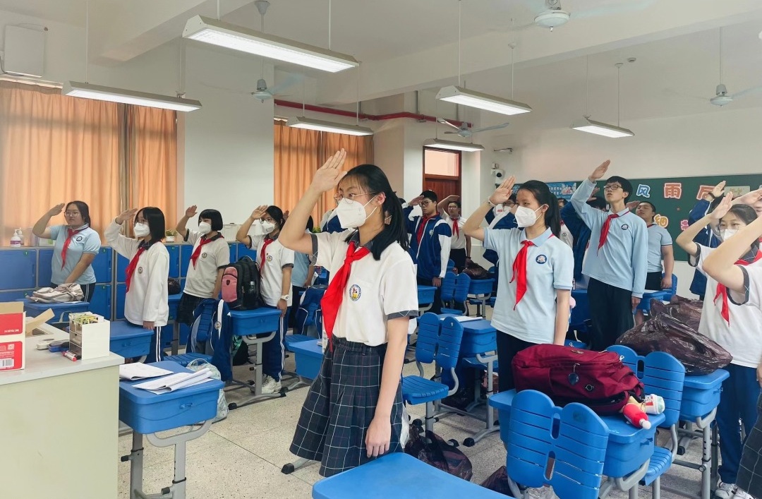 7月7日,上理实验全体初三学子举行了一场特别的中考出征仪式,这场仪式也是他们的少先队退队仪式,标志着他们实现少年蜕变,迎来盛放青春。在即将毕业离队的时刻,全体初三学子们最后一次行队礼、唱队歌。