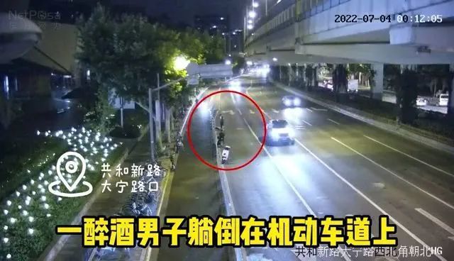 这不,前几天深夜,在静安区共和新路大宁路路口就出现了危险一幕,一名浑身酒气的男子躺倒在了机动车道上。尽管深夜路过的车辆较少,但还是让人捏了把汗。