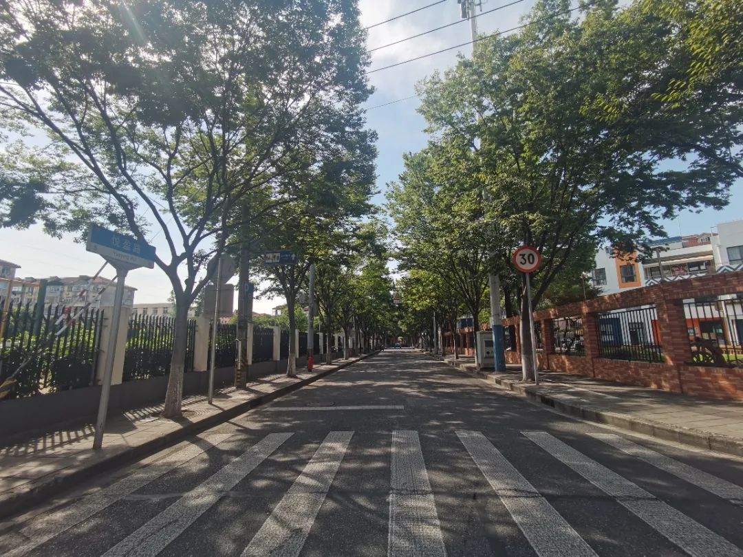盛夏,是漕俞路最美的季节,一公里长的道路两侧种植了250余棵悬铃木,茂密的枝叶交错在马路的上空,围成一条长长的林荫“隧道”,绿荫量达到100%,微风裹着阳光在地面散下点点摇曳的光斑,行走在其中,可以感受到一丝令人舒畅的清凉。漫步在悦盈路,碧绿的榉树叶间,丝丝阳光细碎洒下,阵阵凉风不时袭来,让原本燥热的心顿时变得放松平静下来,非常惬意。“这些树把阳光遮掉了,我们走在路上很舒服,而且还很美观!”市民张先生说。