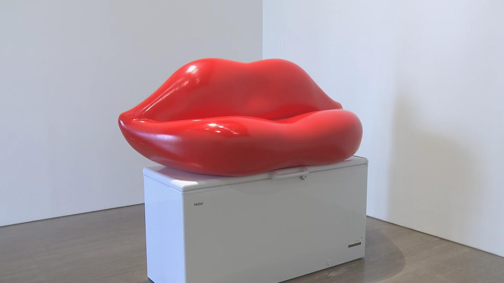 在作品《“红唇”/海尔》中,拉维耶将意大利著名设计品牌Gufram设计的标志性家具嘴唇沙发置于中国品牌海尔冰柜之上,通过物品在颜色与材质上,暖与冷、轻与重的反 差构成张力,突出组合构造和视觉上的吸引力,以巧妙的叠加消弭了物品自身的商业消费属性。