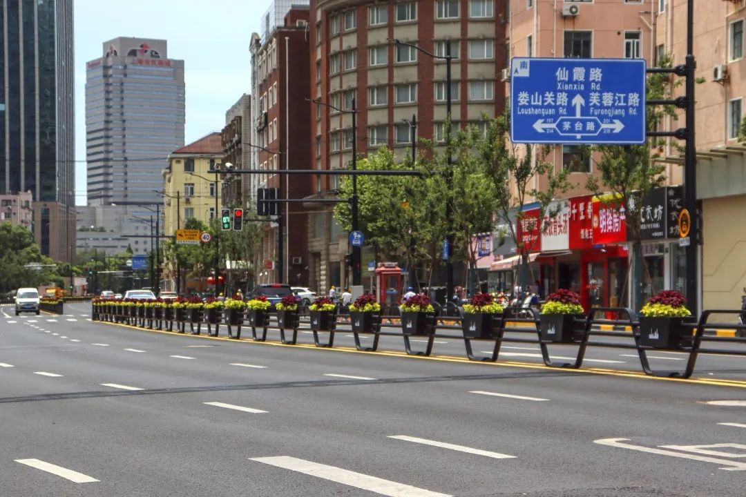 据悉,古北路(天山路-仙霞路)道路改建工程北起天山路,南至仙霞路,改建全长约1公里(含天山路口渠化段),按照“双向6快2慢”的标准进行拓建,并增设了可变车道、交叉口渠化等,2021年年底该工程主体完工并开放双向六车道交通。随后,2022年初道路绿化种植、中央花箱设置等环境提升工作紧锣密鼓地推进,截至6月底已全面完工。