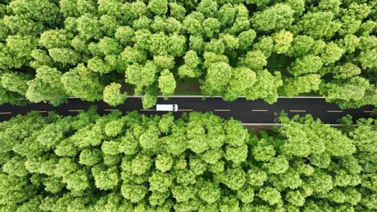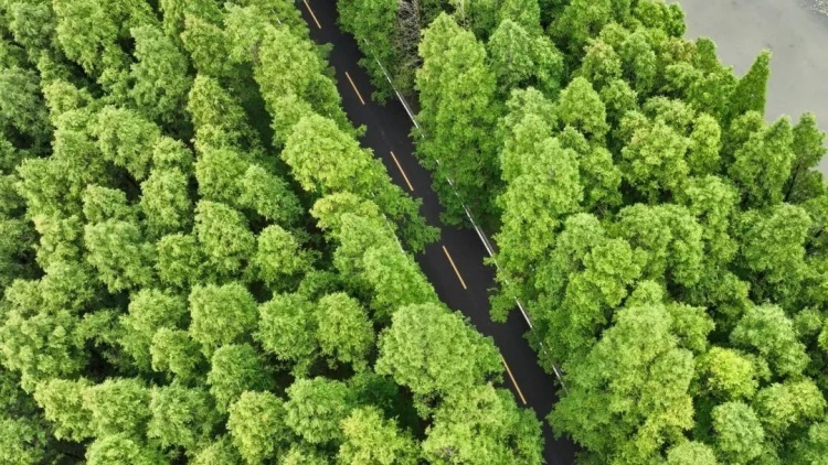 开车行驶在塘下公路上,数列挺拔的水杉与宽敞整洁的道路相映成趣。水杉的枝丫向四周伸展,清新、碧绿的叶子层层叠叠,从高空俯瞰公路,犹如一幅生态画卷。