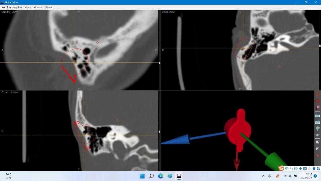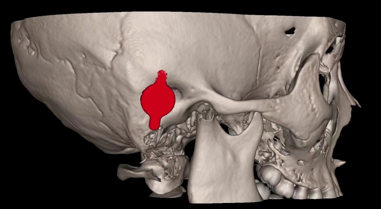 (根据患者颅骨薄层CT三维重建后确定的最佳骨桥基座植入点)