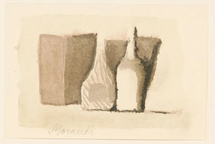 莫兰迪在国内常以“瓶子画家”“莫兰迪色”著称,他常以杯子、盘子、瓶子、盒子、罐子及普通的生活场景作为自己的创作对象,此次展出了他的“瓶子”及“风景”系列的水彩作品。