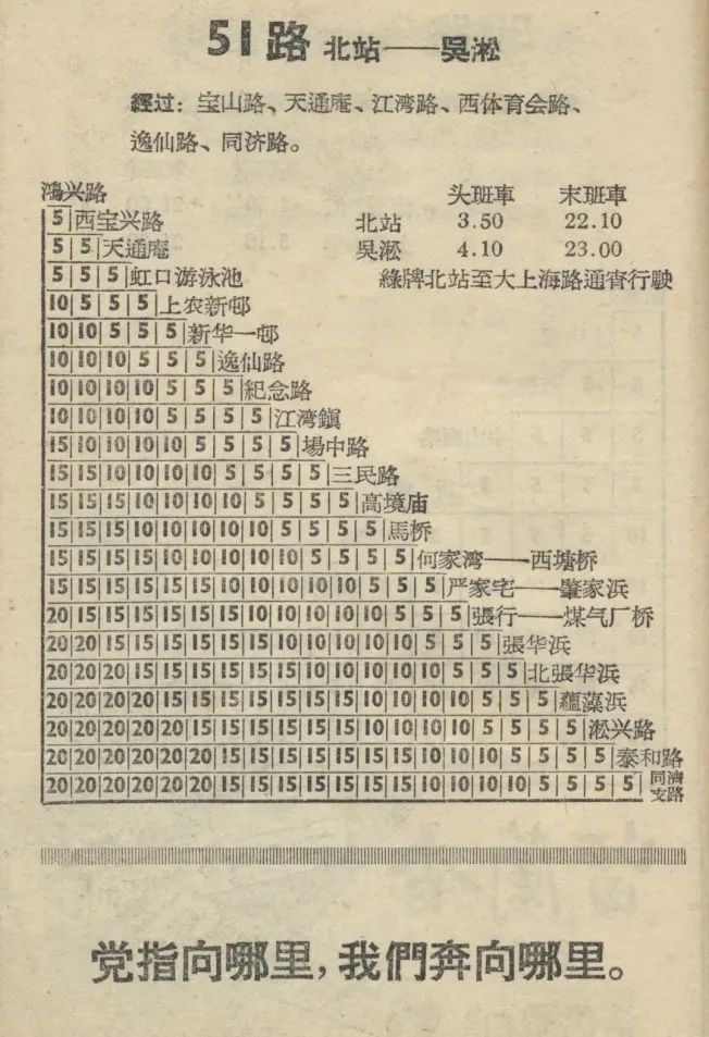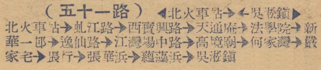 1949年7月1日,51路公共汽车正式开通,自北站(天目东路)至吴淞镇(蕰藻浜大桥北堍)。50年代末,51路分为红绿牌两线车,红牌车向北延伸至吴淞同济支路,绿牌车则经过肇家浜(上钢一厂)、煤气厂桥(吴淞煤气厂),而后以绿牌车走向开通51路夜间通宵车,之后绿牌改为52路。