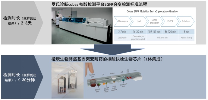 另外, 我们通过结合微流控芯片和纳米粒子胶体生物传感器技术正在开发肺癌EGFR基因突变用药/耐药核酸快检生物芯片,这将是全球第一款癌症核酸快检产品。第一代和第二代EGFR TKI药物对肺癌患者的治疗是有效的,可显著延长晚期EGFR突变患者的生存期。而筛选出EGFR突变患者的伴随诊断成为用药的关键。对标国际最先进的罗氏诊断cobas核酸检测平台,橙康生物开发的核酸快检产品成本低,无需复杂仪器设备,有望将耗时2-3天的肺癌基因突变用药/耐药诊断流程缩短到30分钟以内。减少患者用药等待时间将大大提高治疗效果,降低副作用和潜在的医患纠纷风险。