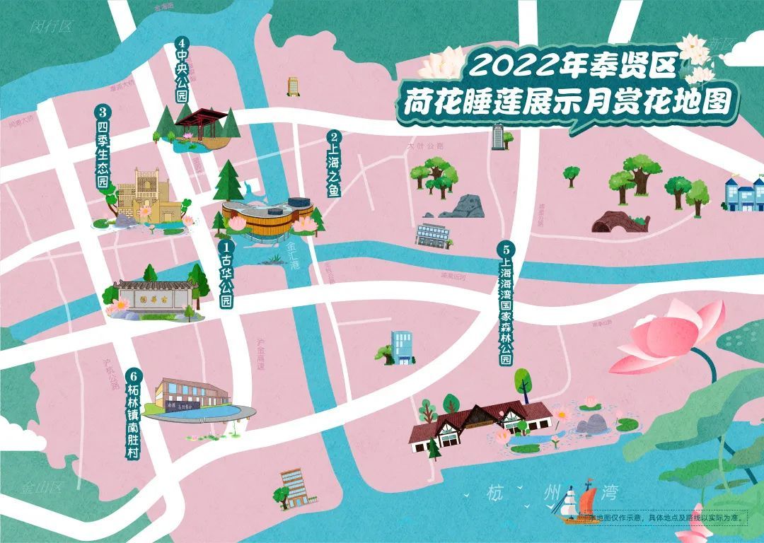 此次活动顺应时势,以“花开疫散,荷你有约”为题,10万余株各类荷花莲花佳丽尽出,将是一场美丽的盛宴。活动以“全域”为布展思路,多层次、多主题、多场景展现荷花莲花的风貌,共有古华公园、上海之鱼、中央公园、四季生态园、上海海湾国家森林公园和柘林镇南胜村六个展区。